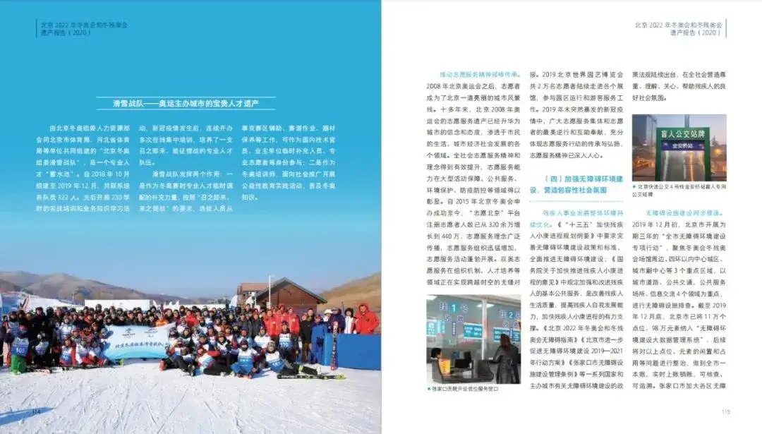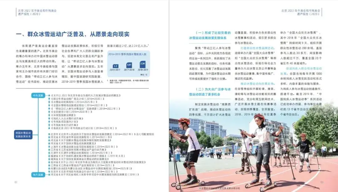 2022年冬奥会和冬残奥会遗产报告(2015年申办成功以来筹办工作所形成的遗产成果,重点呈现了促进中国冰雪运动普及发展,超前谋划场馆赛后利用,持续提升京张地区生态环境,促进京津冀地区协调发展,主办城市转型发展,引领社会文明进步。